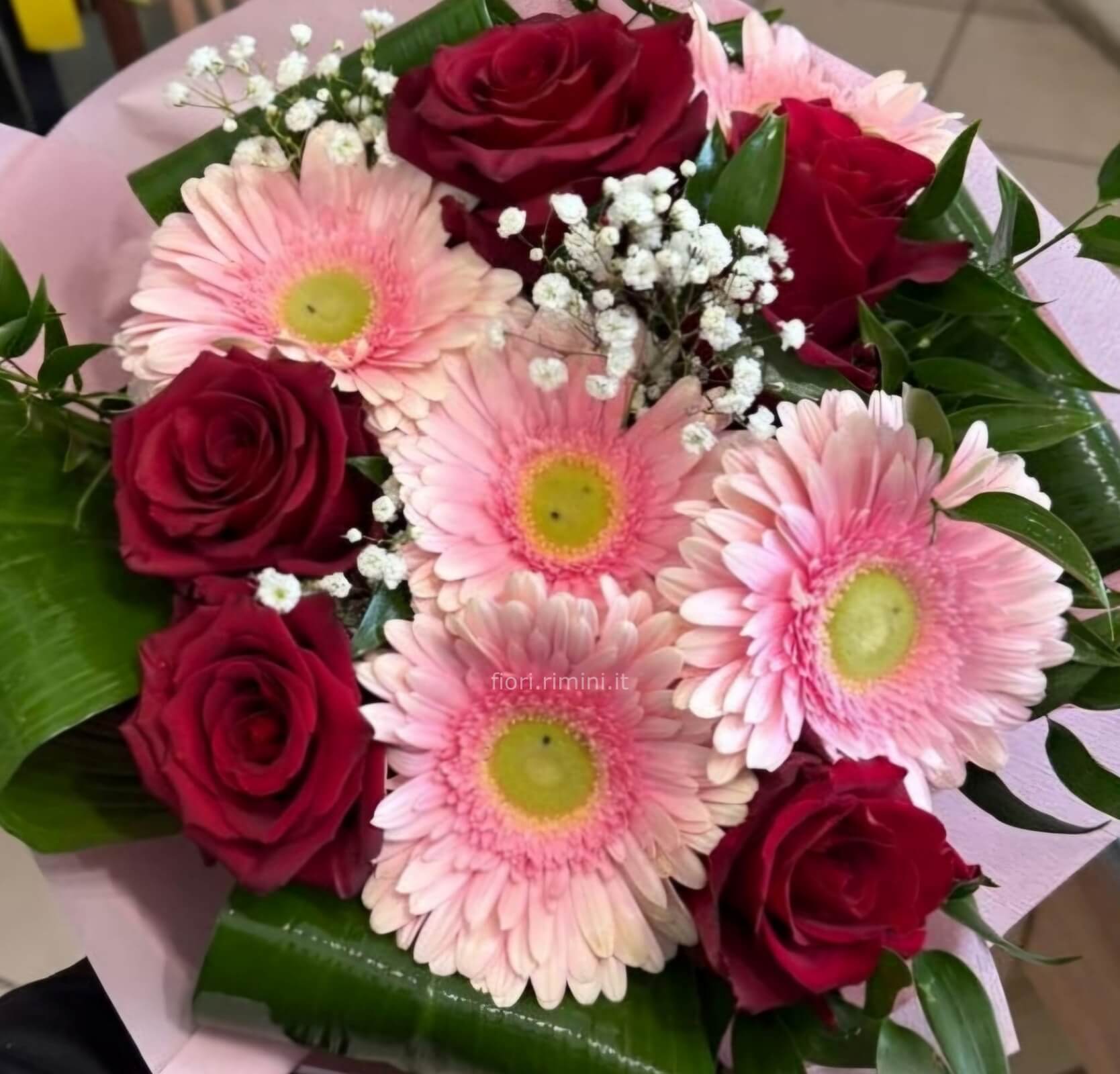 bouquet rose rosse e gerbere rosa